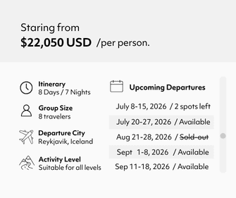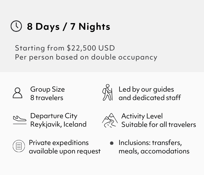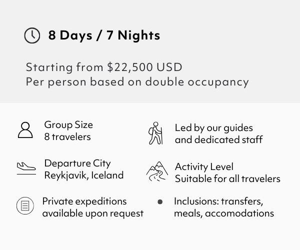 Beginning and ending in Reykjavik, this exclusive, 8-day Iceland expedition delves deep into the country’s interior to visit destinations such as Eyjafjallajökull, Fjallabak, Southern Highlands, Vatnajökull, Langisjór, and Landmannalaugar. Days are lively with multiple hikes and overland explorations through regions of stark beauty, alive with volcanoes, glaciers, canyons, waterfalls, and more. Nights are restful, with accommodation at small boutique hotels and countryside guest houses.